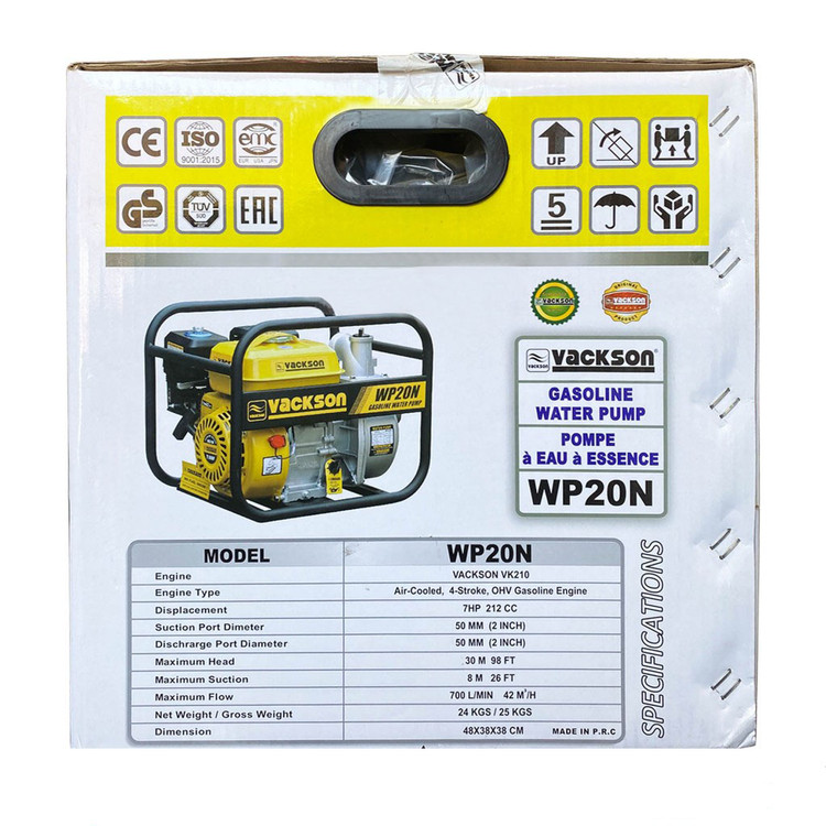 محصولی که اکنون مشاهده می کنید پمپ و موتور آن هر دو ساخت چین می باشند. موتور پمپ واکسون 2 اینچ مدل VACKSON WP20N برای عملکرد از سوخت بنزین استفاده می کند و قطر دهانه ورودی و خروجی آن 2 اینچ می باشد همچنین این موتور پمپ می تواند آب را از ارتفاع 8 متر عمودی مکش کرده و تا ارتفاع مفید 30 متر عمودی یا 450 متر افقی ارسال نماید.