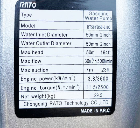محصولی که اکنون مشاهده می کنید پمپ و موتور آن هر دو ساخت چین می باشند.موتور پمپ ارتفاع بالا راتو 2 اینچ 50 متری مدل RT50YB50-3.8Q برای عملکرد از سوخت بنزین استفاده می کند و قطر دهانه ورودی و خروجی آن 2 اینچ می باشد همچنین این موتور پمپ می تواند آب را از ارتفاع 7 متر عمودی مکش کرده و تا ارتفاع مفید 50 متر عمودی یا 700 متر افقی ارسال نماید.