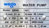 پمپ نیم اسب ویگو wego- از ویژگی های این پمپ میتوان به میزان انتقال اب تا ارتفاع 31 متر و حداکثر آبدهی 30 لیتر در دقیقه اشاره کرد.