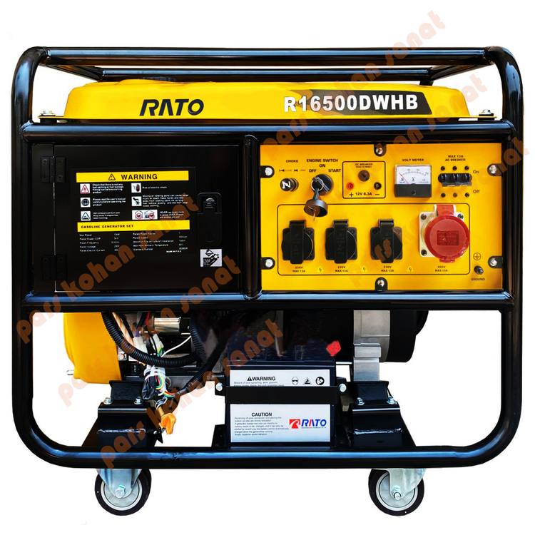 این ژنراتور برق تحتعنوان مدل «RATO r16500dwhb (تکفاز و سه فاز)» عرضه شده است. این موتور برق انرژی موردنیاز خود را از طریق احتراق بنزین تامین میکند. مخزن سوخت بنزین این محصول حجمی برابر با 30 لیتر دارد. موتوری که از این سوخت انرژی الکتریکی تولید میکند، از نوع چهارزمانه است و قدرتی معادل 22 اسب بخار دارد. این موتور دو سیلندری به کمک جریان هوا خنک میشود و صدای 68 دسیبلی تولید میکند. با کمک این محصول میتوانید برق AC و DC موردنیاز دستگاههای برقی خود را تامین کنید. سیم پیچی موتور برقهای راتو 100% از مس میباشد . توان این ژنراتور 10000 وات است و از طریق سه پریز درپوشدار برق AC را در اختیار کاربر قرار میدهد. این برق ولتاژی برابر با 220-230 ولت دارد. همچنین برق DC خروجی نیز با ولتاژی برابر 12 ولت از شدتجریانی 8.3 آمپری برخوردار است. این محصول وزن مناسبی دارد که به راحتی قابل جا به جای است.
