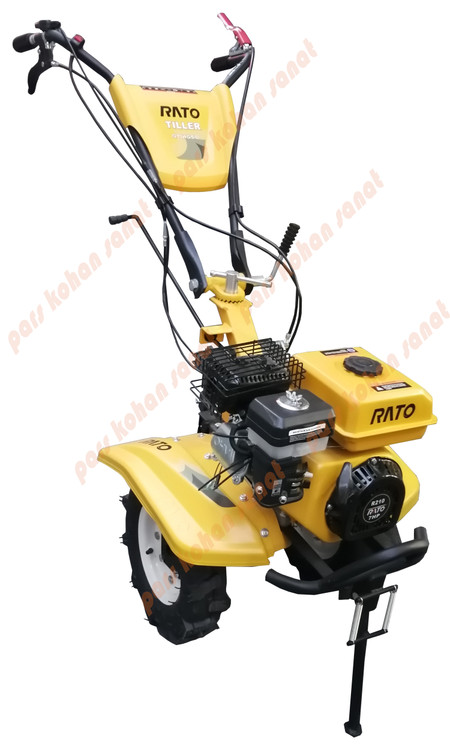 تیلر راتو 7.5 اسب اورجینال (شاسی-موتور-گیربکس راتو اصلی) انجام کار شخم زنی باغات-پاکنی دور درختان-جابه جای بار و محصولات باغ-نصب پمپ سمپاش-نصب پمپ اب-نصب گاو اهن و نهر کن جهت جوی اب از جمله کارایهای این دستگاه میباشد.تیلرکلتیواتور راتو از بهترین و قدیمی ترین برند تیلر میباشد تیلر کلتیواتور 7 اسب بنزینی راتو با گیربکس راتو اورجینال دارای موتور از نوع بنزینی با 7 اسب بخار قدرت میباشد. سوخت این موتورها بنزینی میباشد. گیربکس این دستگاه ها مدل 1100 میباشد که در هر دونوع بنزینی و گازوئیل یکی میباشد. همچنین انتقال قدرت بین موتور و گیربکس بصورت شافت مستقیم با چرخ دنده میباشد. همچنین گیربکس آنها دارای شافت P.T.O (شافت هرزگرد خروجی گیربکس جهت استفاده های کاربردی مانند نصب سمپاش، ژنراتور و…) میباشد. تیلر کلتیواتور 7 اسب بنزینی راتو دارای 3 دنده میباشد، دو دنده جلو یک دنده عقب فرمان این دستگاه ها از مدل جدید میباشد که شبیه به یک بازو طراحی شده که از طرفین به چپ و راست به راحتی حرکت کرده و همچنین با بالا یا پایین برای تنظیم قد حرکت میکند. چرخ این تیلر ها در بازار در 2 نوع ارائه میشود. چرخ کوچک:لاستیک با اندازه 400 در رینگ 10 و چرخ بزرگ:لاستیک با اندازه 500 در رینگ 12 که اغلب دستگاه های موجود در بازار با این نوع لاستیک ارائه میگردند. عرض کار این دستگاه ها 80 تا 130 سانتی متر میباشد و عمق کار آنها از 15 تا 30 سانتی متر میباشد. موتور تیلر کلتیواتور 7 اسب بنزینی راتو از نوع بنزینی می باشد. در ساخت آن از موتور های احتراقی چهار زمانه استفاده می شود. موتور دارای کارتل روغن بوده و به سیستم روغن رسانی مجزا مجهز می باشد. نوع هواکش (ساسات) در مدل های امروزی اتومات است. گاز به صورت دستی در اختیار راکب قرار دارد. گیربکس در ساخت کولتیواتور یا همان شخم زن راتو برای انتقال نیروی به وجود امده توسط موتور از یک گیربکس کتابی واسط ۲تا ۴ دنده استفاده می شود (در بعضی از مدل ها گیربکس دارای دنده عقب می باشد). گیربکس معمولا از نوع تک محور بوده و برای عوض کردن دنده ها از قطعه تقسیم دنده استفاده می کند. پوسته گیربکس ریخته گری المینیوم و دنده ها فولادی می باشند. شاسی تیلر کلتیواتور 7 اسب بنزینی راتو از دو محور شبیه هم که در مقابل هم قرار دارند و توسط یک صفحه فلزی به هم متصل شده اند ساخته می شود. موتور در قسمت جلوی شاسی و گیربکس در زیر موتور تعبیه شده است. در انتها دسته فرمان کلتیواتور قرار دارد که گاز و کلاج دستگاه بر روی آن قرار دارد. شاسی کلتیواتور کاما بر روی دو چرخ مقابل هم بر روی یک محور حرکت می کند. تجهیزات تایر ها آج بلند بوده و مناسب حرکت بر روی انواع زمین کشاورزی ( دیم، قرق آبی،مزرعه،شالی…) می باشند. تیغه های تیلر کلتیواتور 7 اسب بنزینی راتو در دو طرف دستگاه قرار دارد. تیغه ها طراحی ناخن انگشتی دارند و از فولاد ساخته شده اند. موارد مصرف به علت اندازه کوچک تر این دستگاه نسبت به انواع تراکتور ها این وسیله در باغ های میوه بسیار کاربرد دارد.